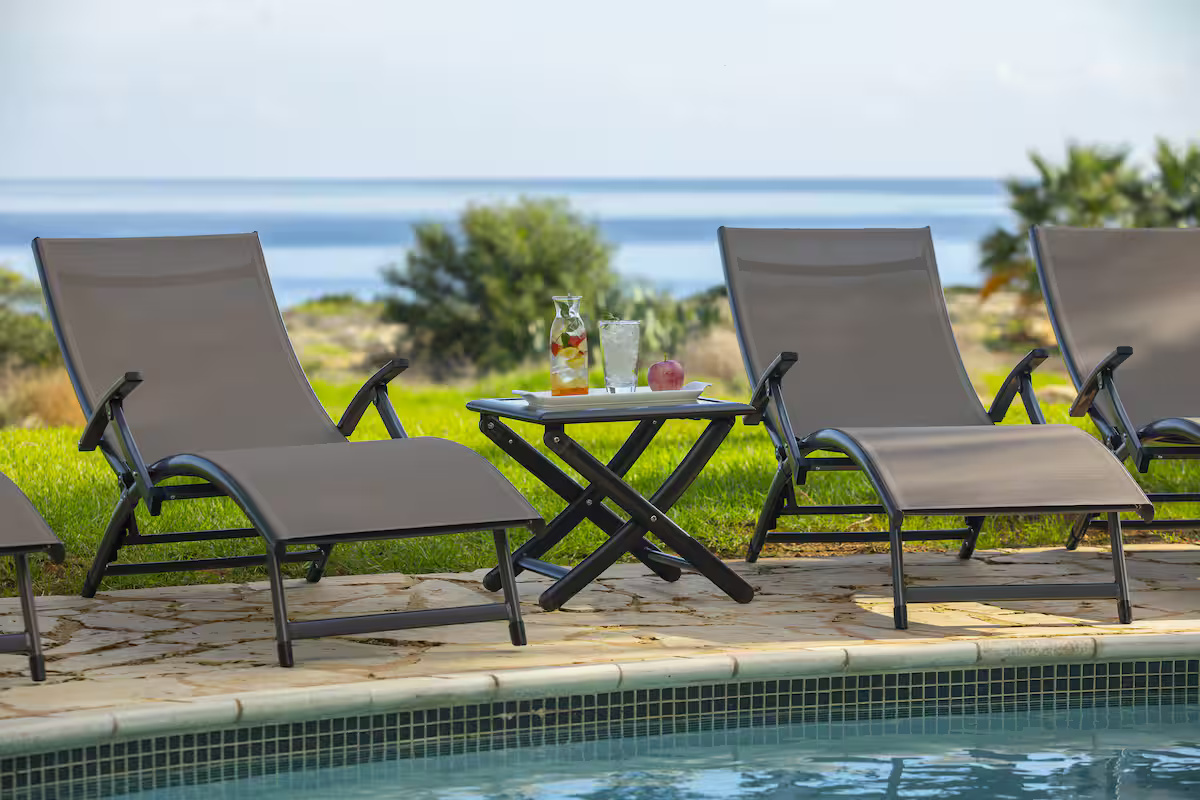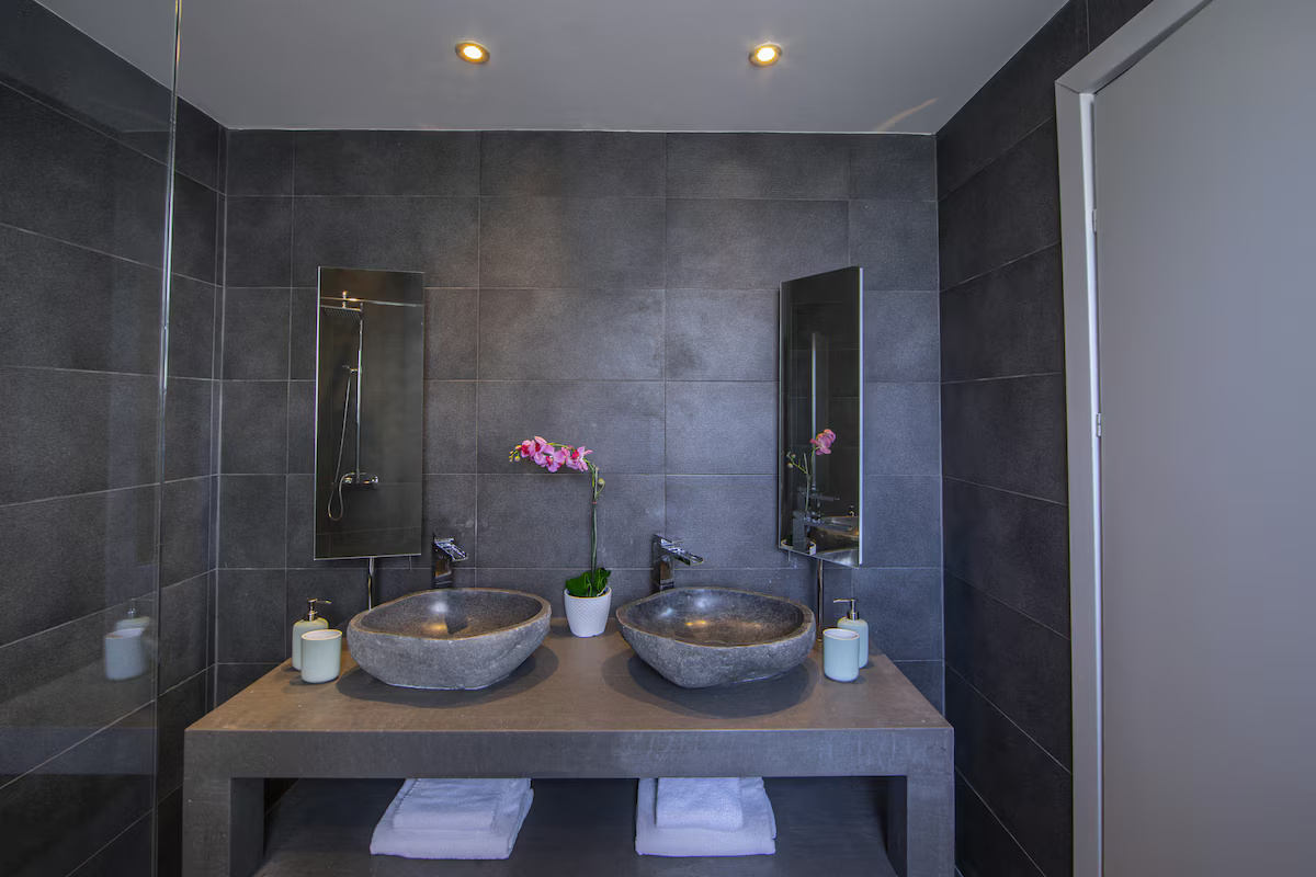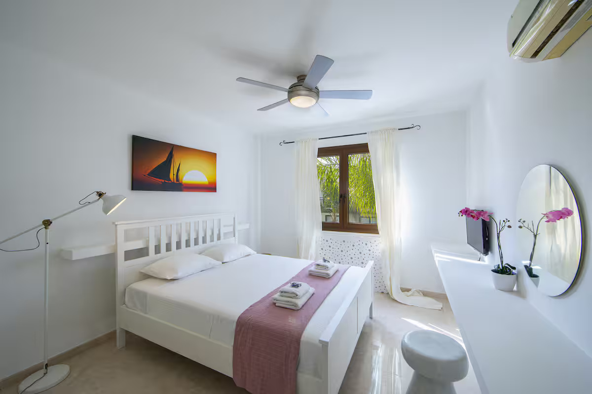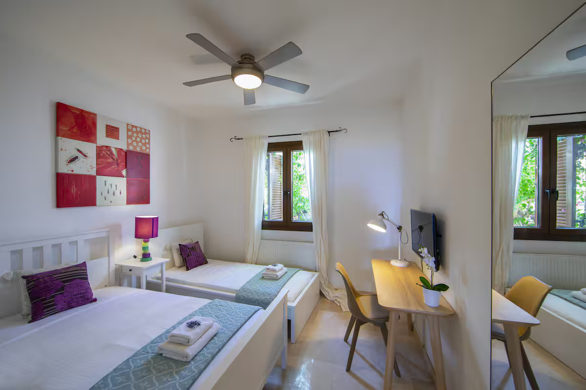 Inside, the villa unfolds across bright and welcoming open-plan living and dining areas, flooded with natural light and seamlessly connected to the outdoor spaces. The modern kitchen is fully equipped with top-of-the-line appliances and stylish cabinetry, offering both functionality and contemporary sophistication. The four spacious bedrooms are designed with comfort in mind, each featuring air conditioning, flat-screen televisions, and soundproofed windows. The upper floor hosts three bedrooms, including the master suite with an en-suite bathroom and panoramic sea views, while two additional bedrooms share a family bathroom. The ground-floor bedroom, fitted with twin beds, enjoys convenient access to a guest bathroom, making it ideal for visitors or extended family.